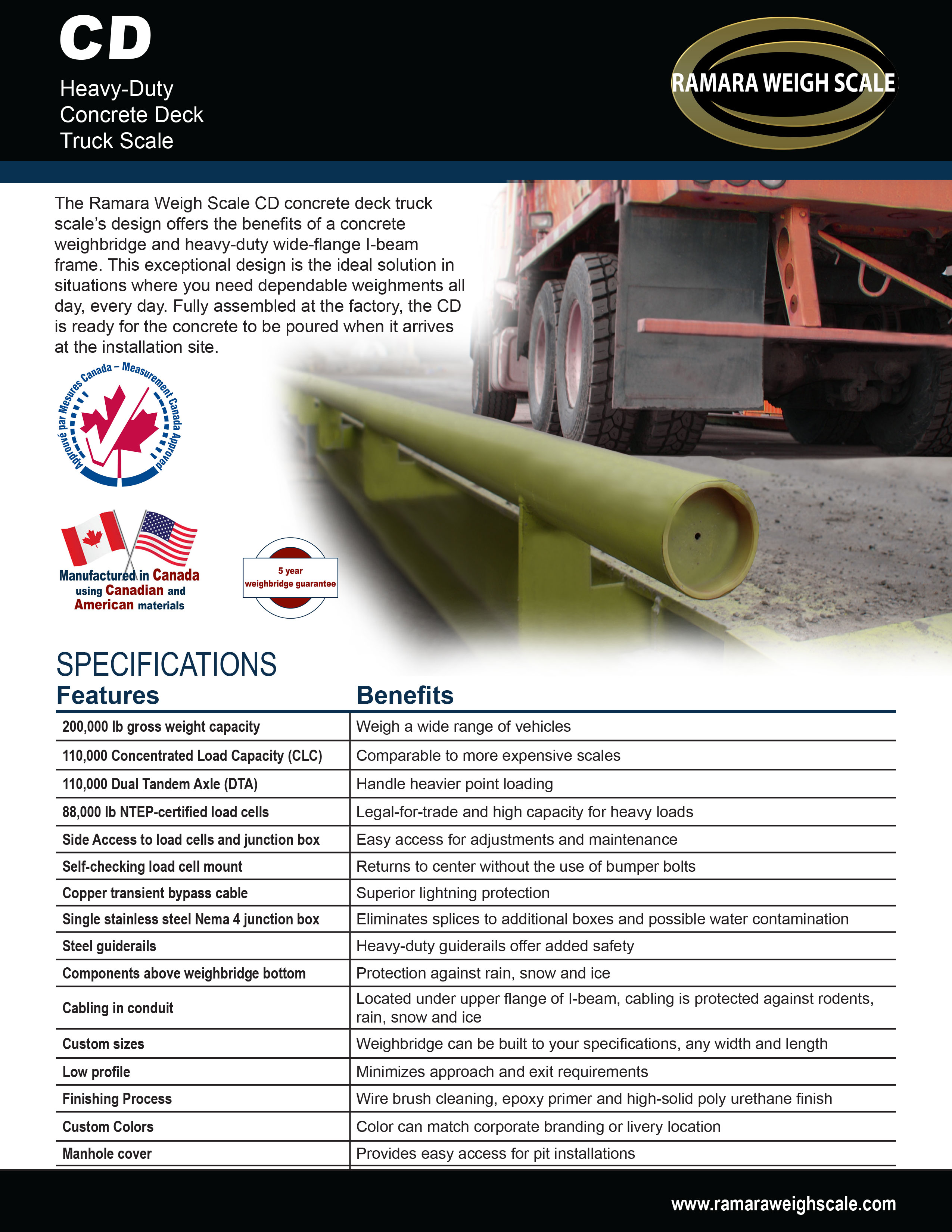 Ramara Weigh Scale SD and CD truck scales offer an unbeatable combination of structural integrity and cost-effective vehicle weighing. Wide-flange beams and cross members provide exceptional strength and durability. Steel or concrete deck models are available to meet the needs of your application. A low 20-inch profile reduces construction cost by allowing for a shorter approach.